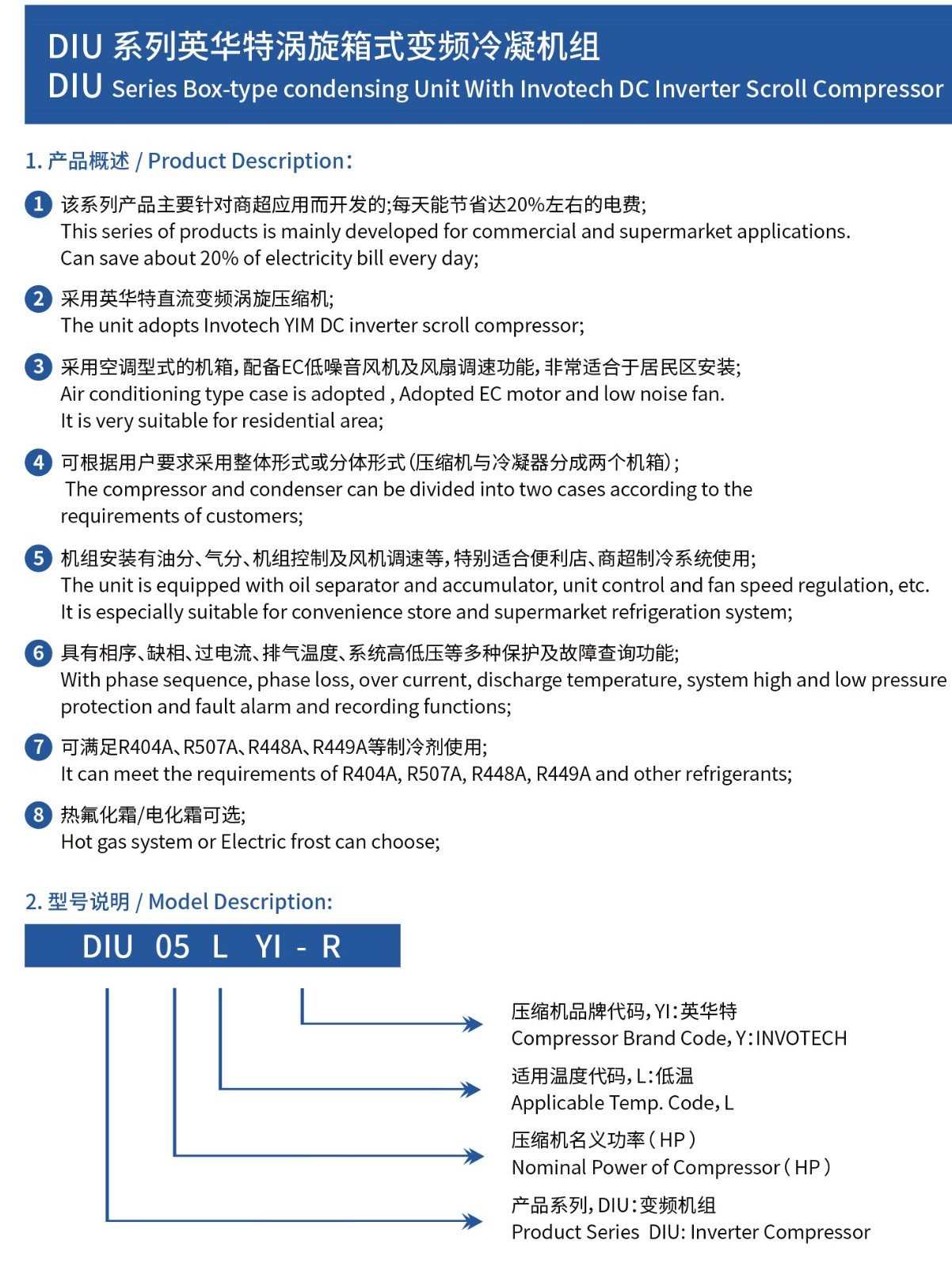 DIU系列英華特渦旋箱式變頻冷凝機(jī)組該系列產(chǎn)品主要針對(duì)商超應(yīng)用而開發(fā)的;每天能節(jié)省達(dá)20%左右的電費(fèi);